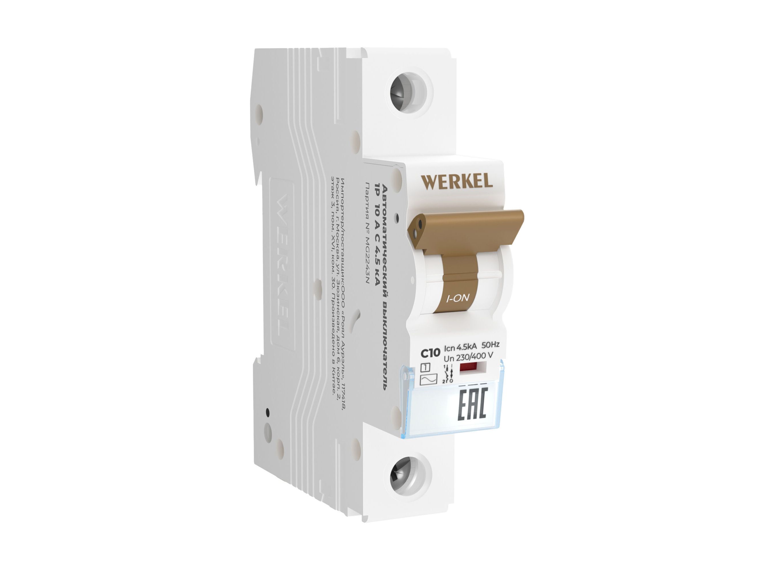<p><strong>Модель АВ W901P104</strong> – это однополюсный механизм (1P), который применяется для защиты фазного провода в однофазных линиях электропитания. Автоматический выключатель Werkel обладает номинальным током 10 А с время-токовой характеристикой C (универсальный бытовой). Отключающая способность составляет 4,5 кА.</p>