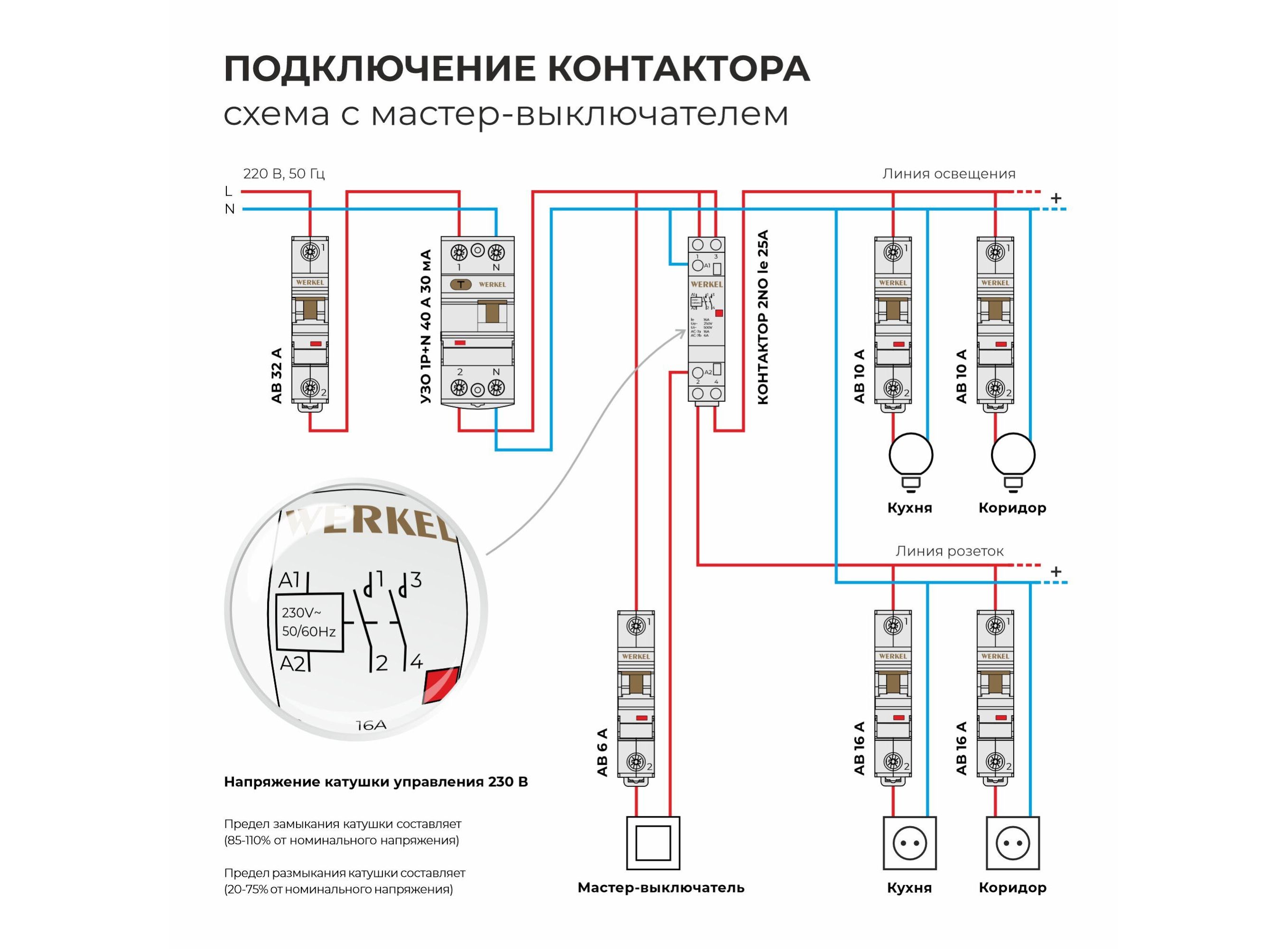 Контактор – это электромагнитное реле, предназначенное для замыкания и размыкания силовых электрических цепей. Он используется для управления мощными электрическими приборами в системах отопления, вентиляции, водоснабжения, полива, освещения придомовых территорий и дорог. Контакторы незаменимы в схемах освещения с мастер-выключателем.