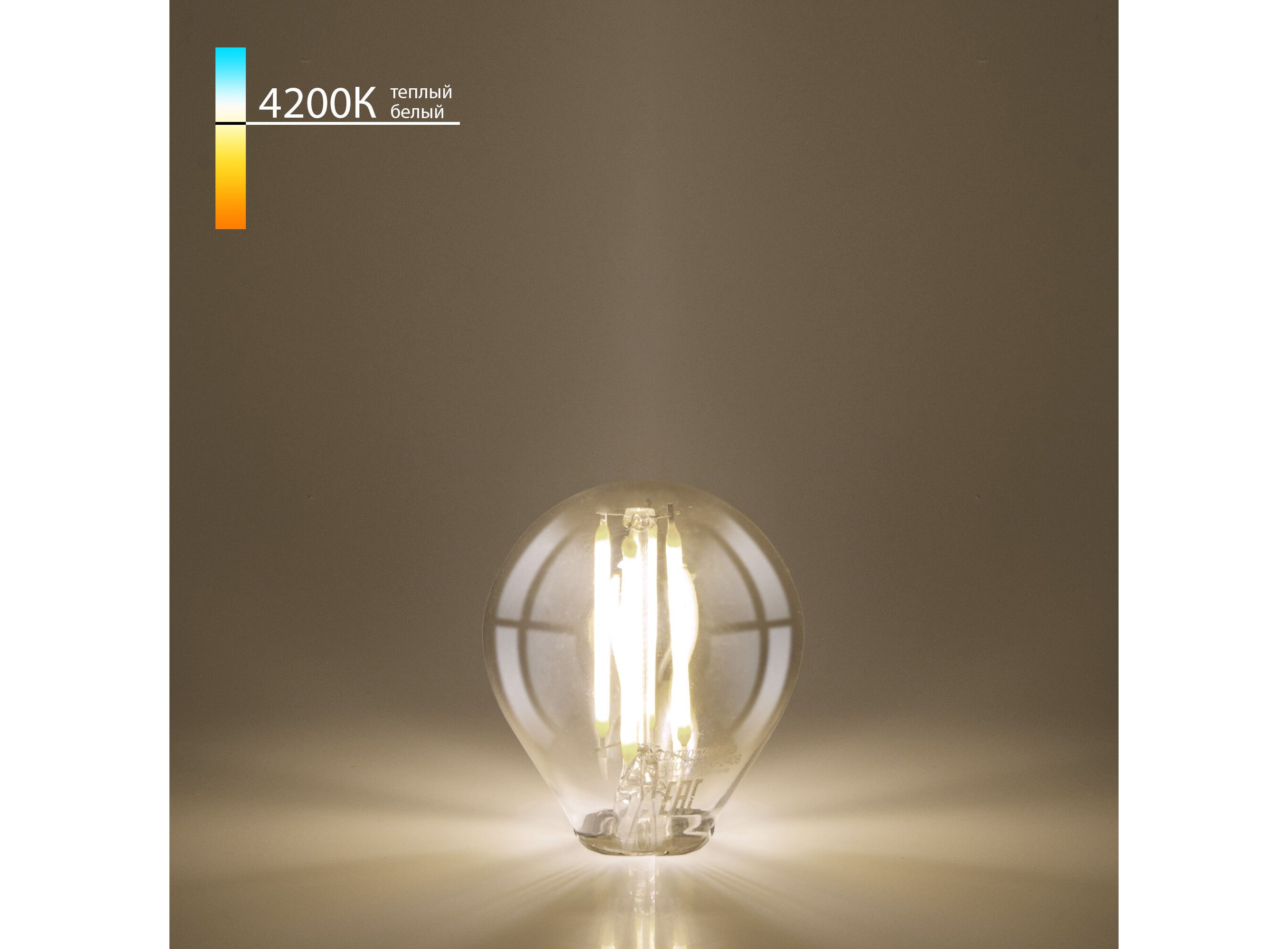 <p>Филаментная светодиодная лампочка с цоколем E14 и размерами 77 мм по высоте и 45 мм в диаметре обладает мощностью 9W. Цветовая температура – 4200 К, т.е. естественный белый свет. Ориентировочный срок службы составляет 50000 ч. Изделие рассчитано на использование в сети с переменным напряжением в 220-240В.</p>