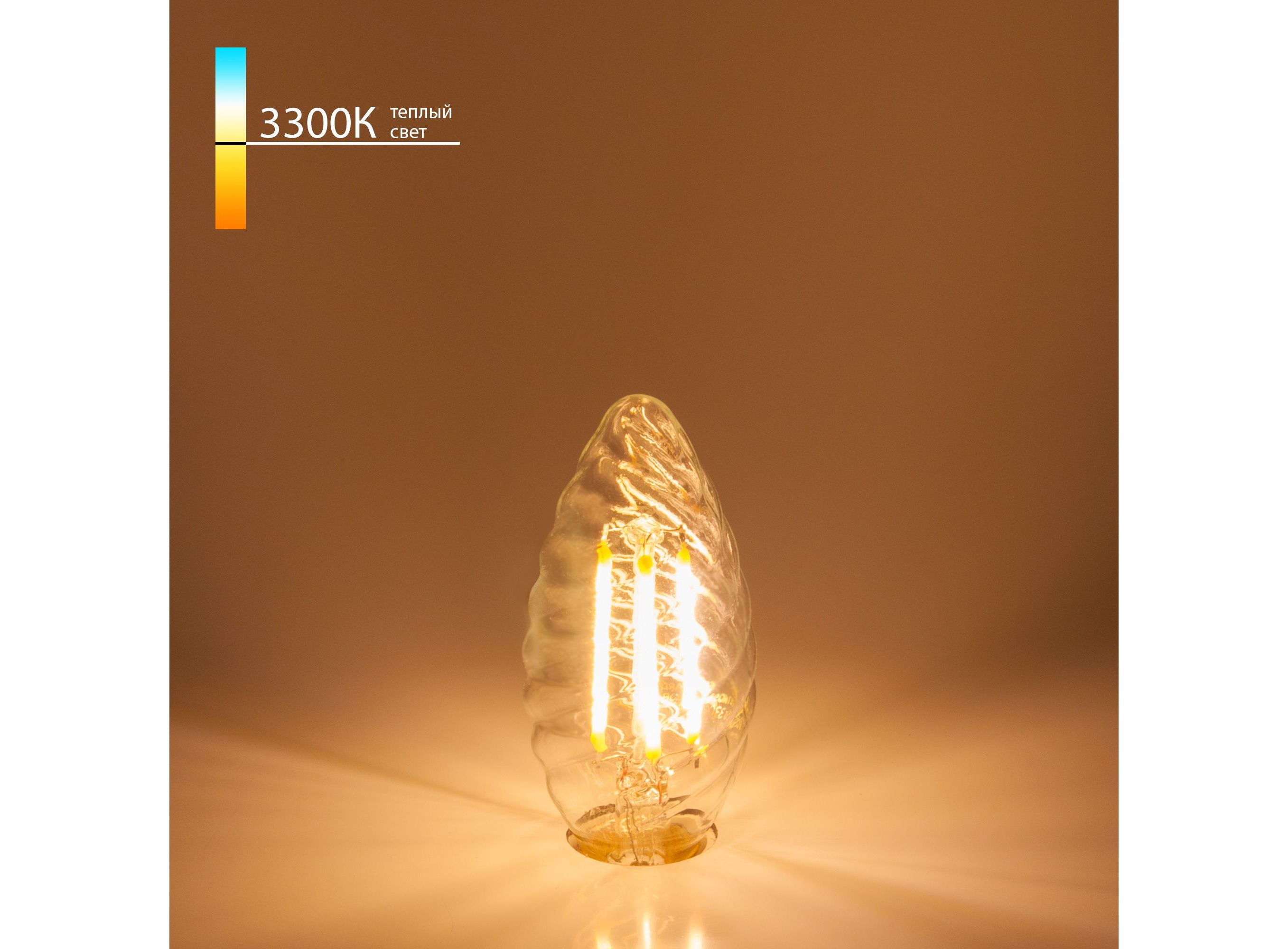 Филаментная светодиодная лампа "Свеча витая" CW35 7W 3300K E14 прозрачная. Это вид светодиодных ламп, которые внешне максимально приближены к лампам накаливания. Они имеют полностью прозрачную стеклянную колбу и цоколь, а внутри расположены светодиоды вместо нити накала. <p> <p> Филаментная светодиодная лампочка с цоколем Е14 и размерами 100 мм по высоте и 35 мм в диаметре обладает мощностью 7W. Цветовая температура – 3300 К, т.е. теплый свет близкий к цвету Солнца. Ориентировочный срок службы составляет 50000 ч. Изделие рассчитано на использование в сети с переменным напряжением в 220-240В. <p> <p>