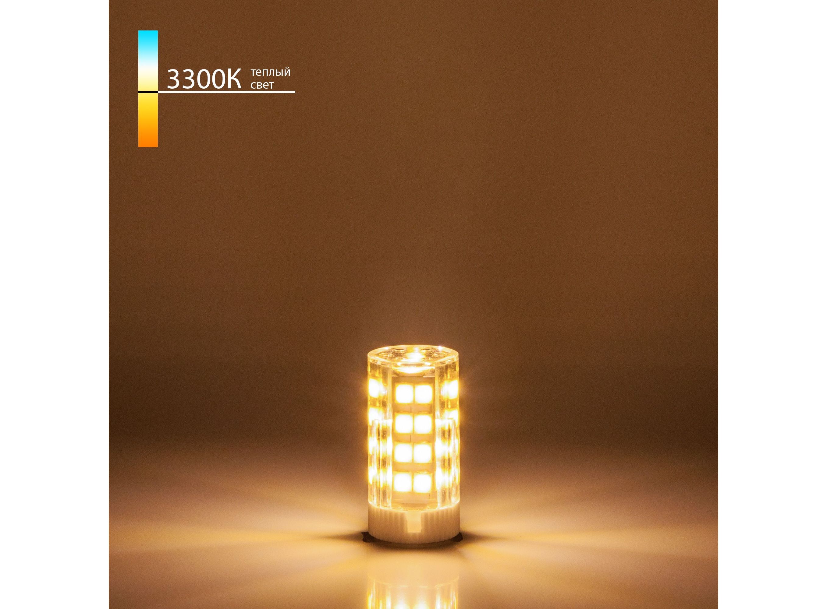 Светодиодная лампа JCD 7W 220V 3300K G9. Светодиодная лампочка с цоколем G9 и размерами 50 мм по высоте и диаметром в 17 мм обладает мощностью в 7W. Цветовая температура – 3300 К, т.е. теплый свет близкий к цвету Солнца. <p><p>Ориентировочный срок службы составляет 50000 ч. <p>