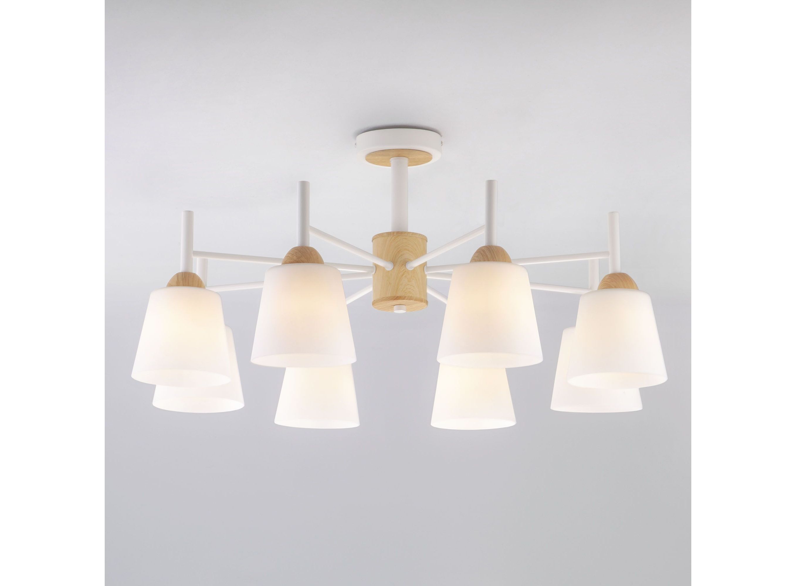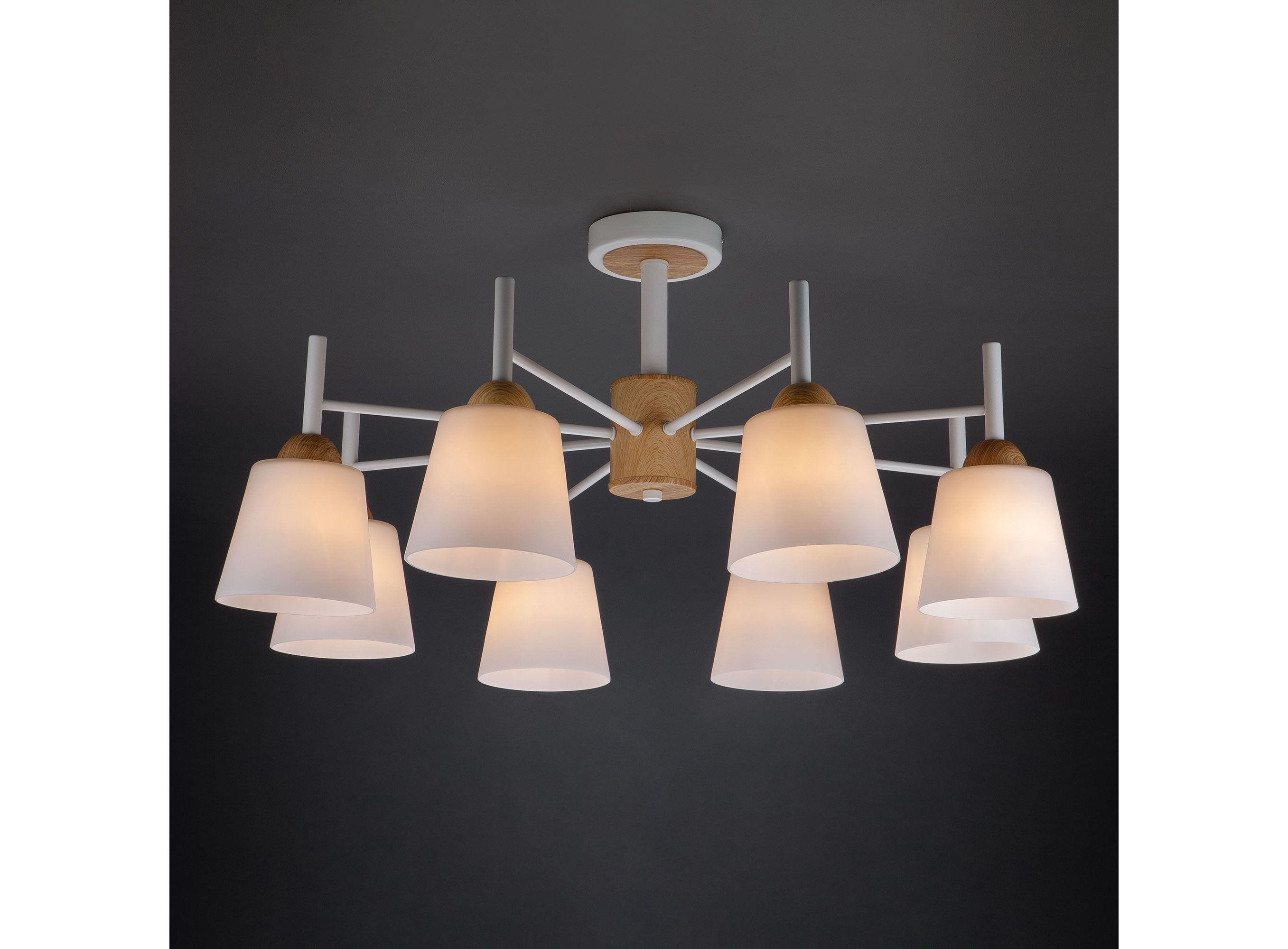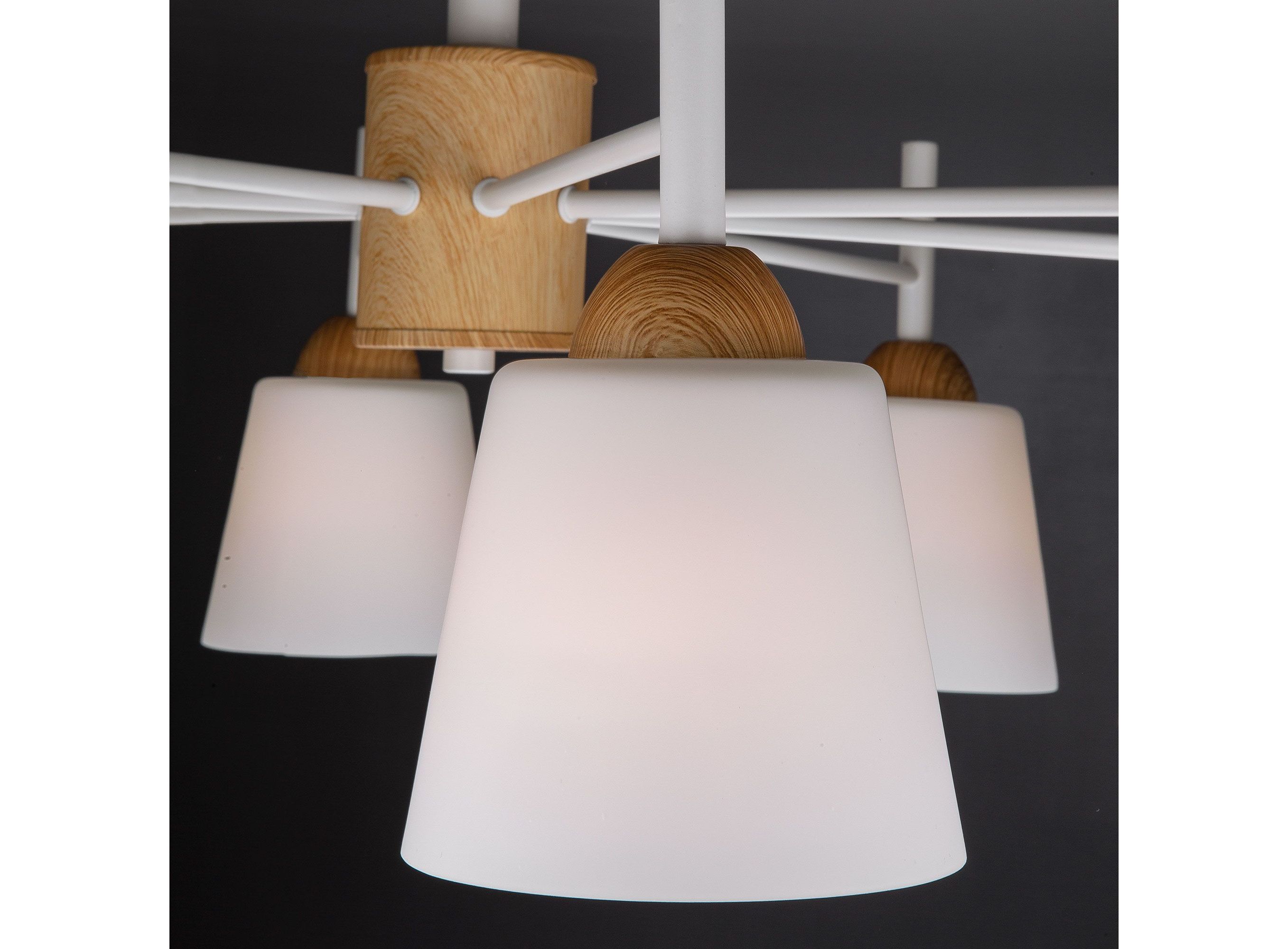 <p>Люстра дополнена матовыми стеклянными плафонами обеспечивающими мягкий, рассеянный свет создавая уютную и комфортную атмосферу в вашей гостиной, спальне или столовой, а плавные линии белого металлического каркаса гармонично сочетающиеся с абажурами конической формы и декоративными элементами, имитирующими натуральное дерево, добавляют нотку скандинавского стиля.</p>