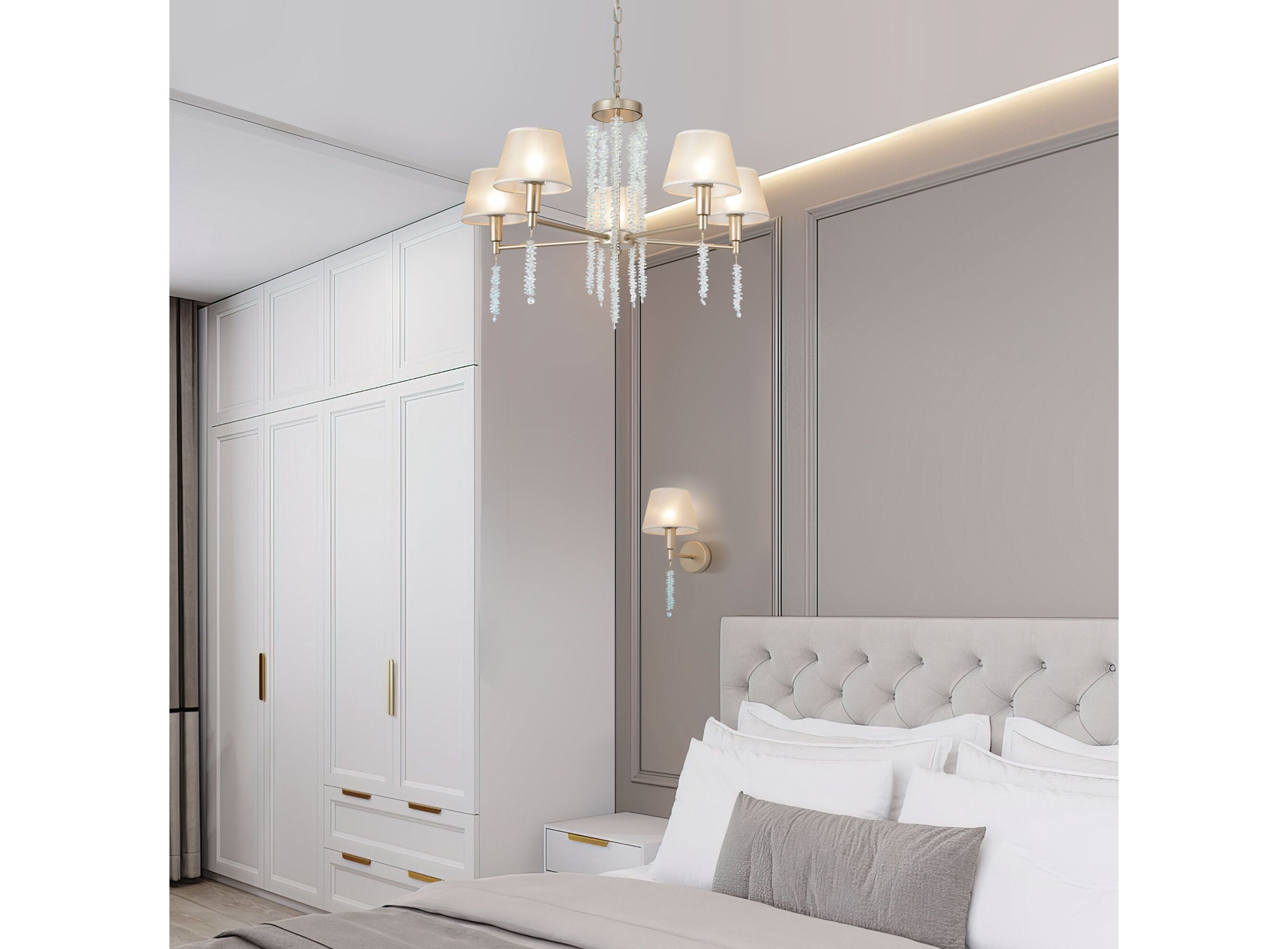 <p>Создать качественное освещение вам поможет классическая подвесная люстра с тканевыми абажурами. Простые минималистичные формы и сдержанные тона станут идеальным дополнением для вашего интерьера. Люстра украсит потолок вашей спальни и создаст полноценное освещение на площадь 9 м&sup2;.</p> <p>В люстре рекомендуется использовать сменные лампы накаливания с цоколем Е14 с максимальной мощностью 40 Вт. В производстве люстры использовали высококачественный металл с надежным защитным покрытием и закаленное стекло. &nbsp;</p>