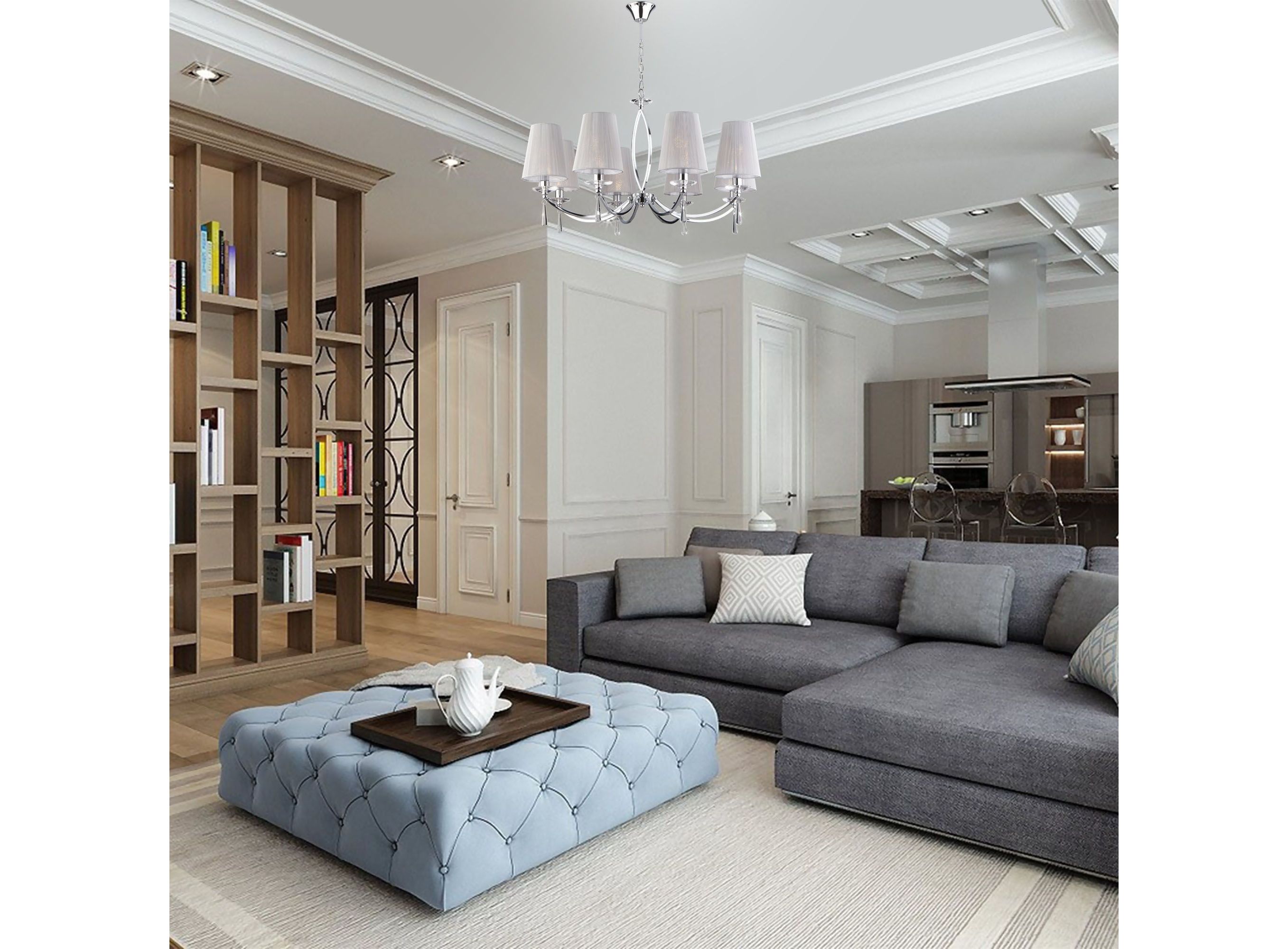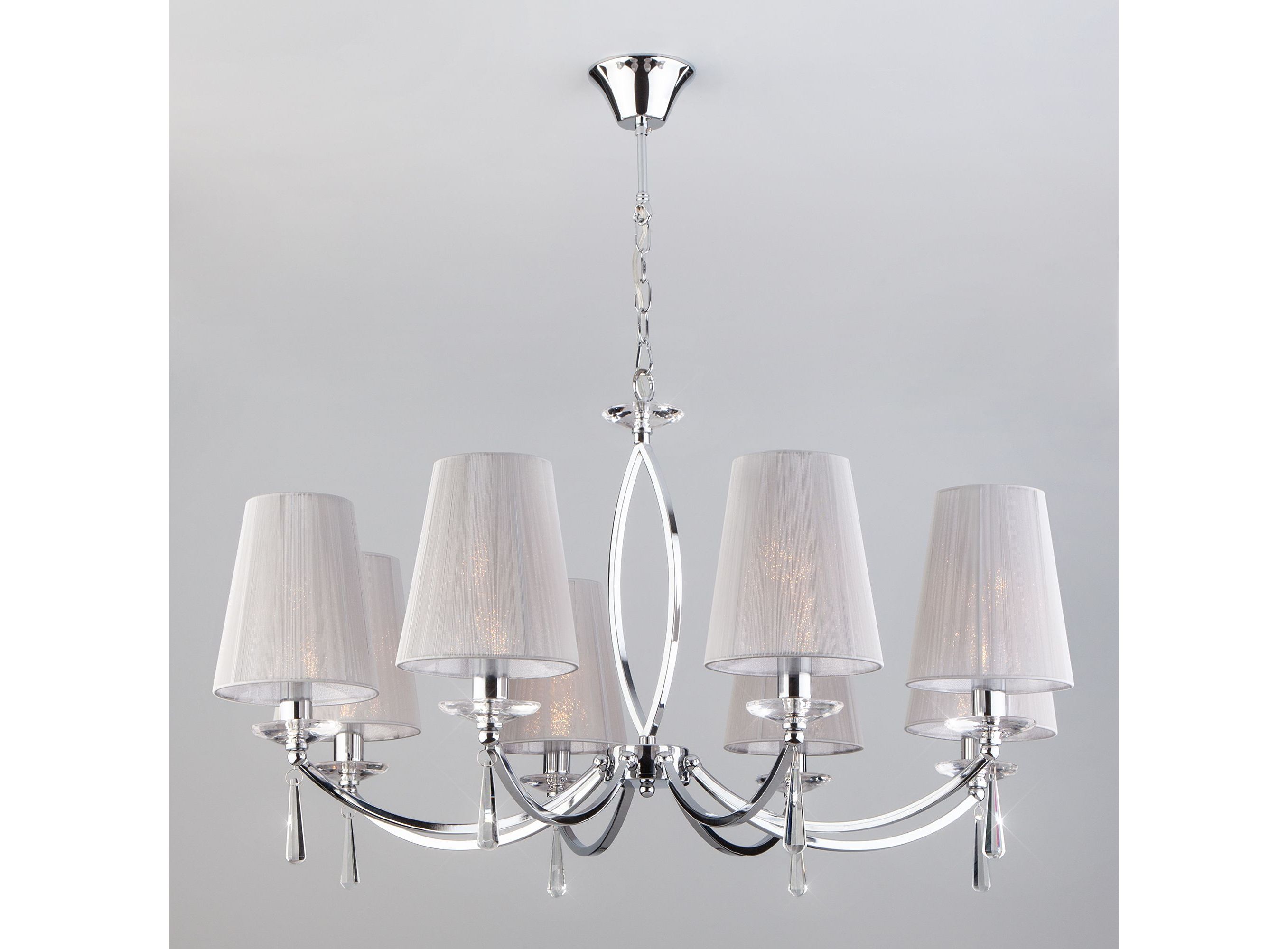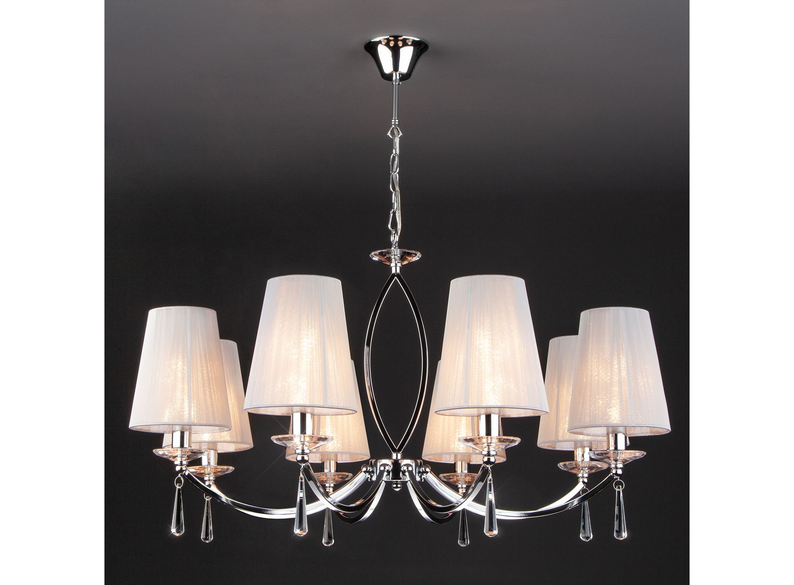 <p>Подвесная люстра на 8 рожков цвета хром предназначена для создания основного освещения в современных и классических интерьерах, подходит для различных типов помещений: гостиная, спальня и рассчитана на площадь освещения 21 м². Роскошная люстра оснащена патронами с цоколем Е14, которые рассчитаны на максимальную мощность ламп 40 Вт.</p>