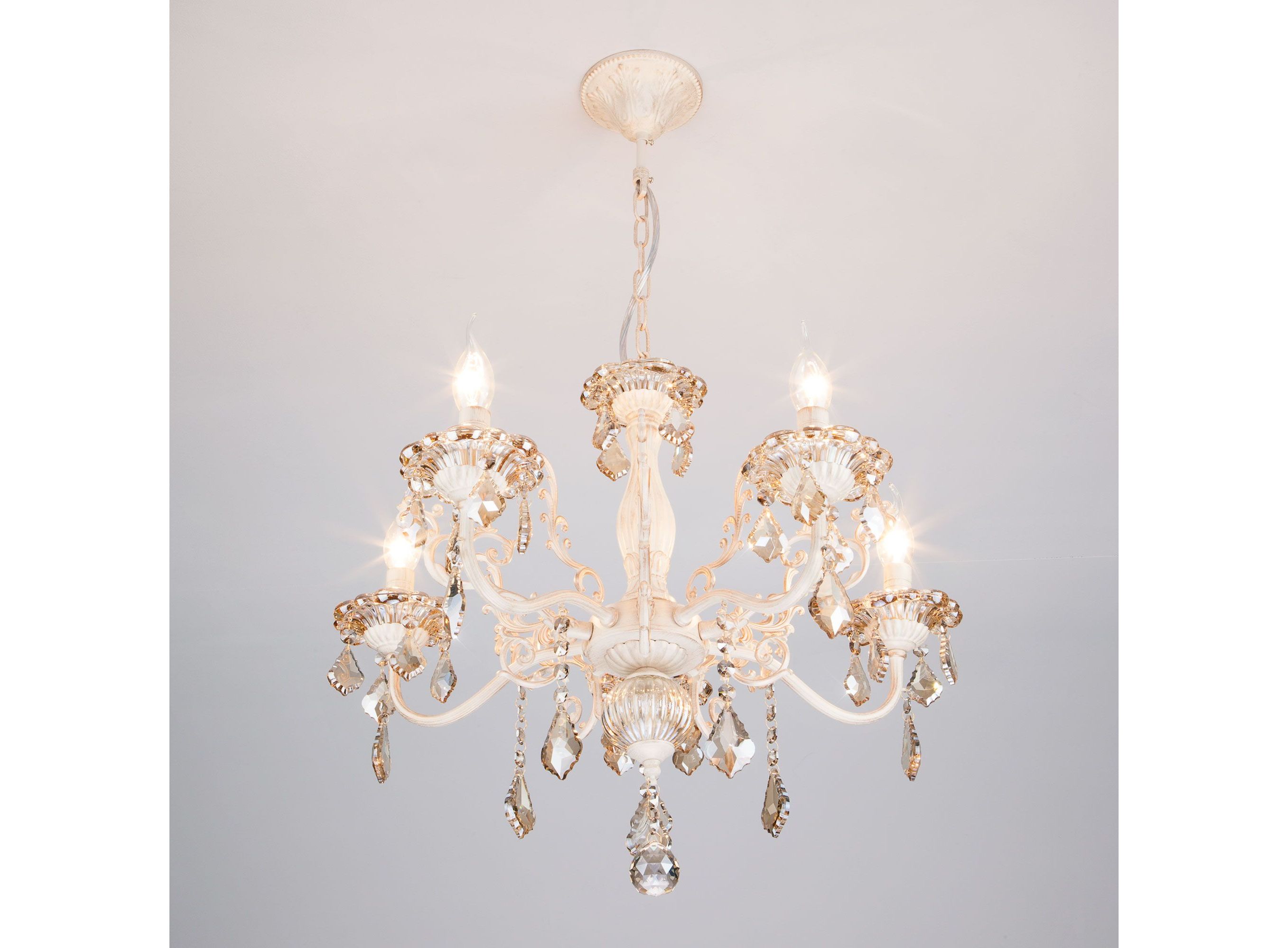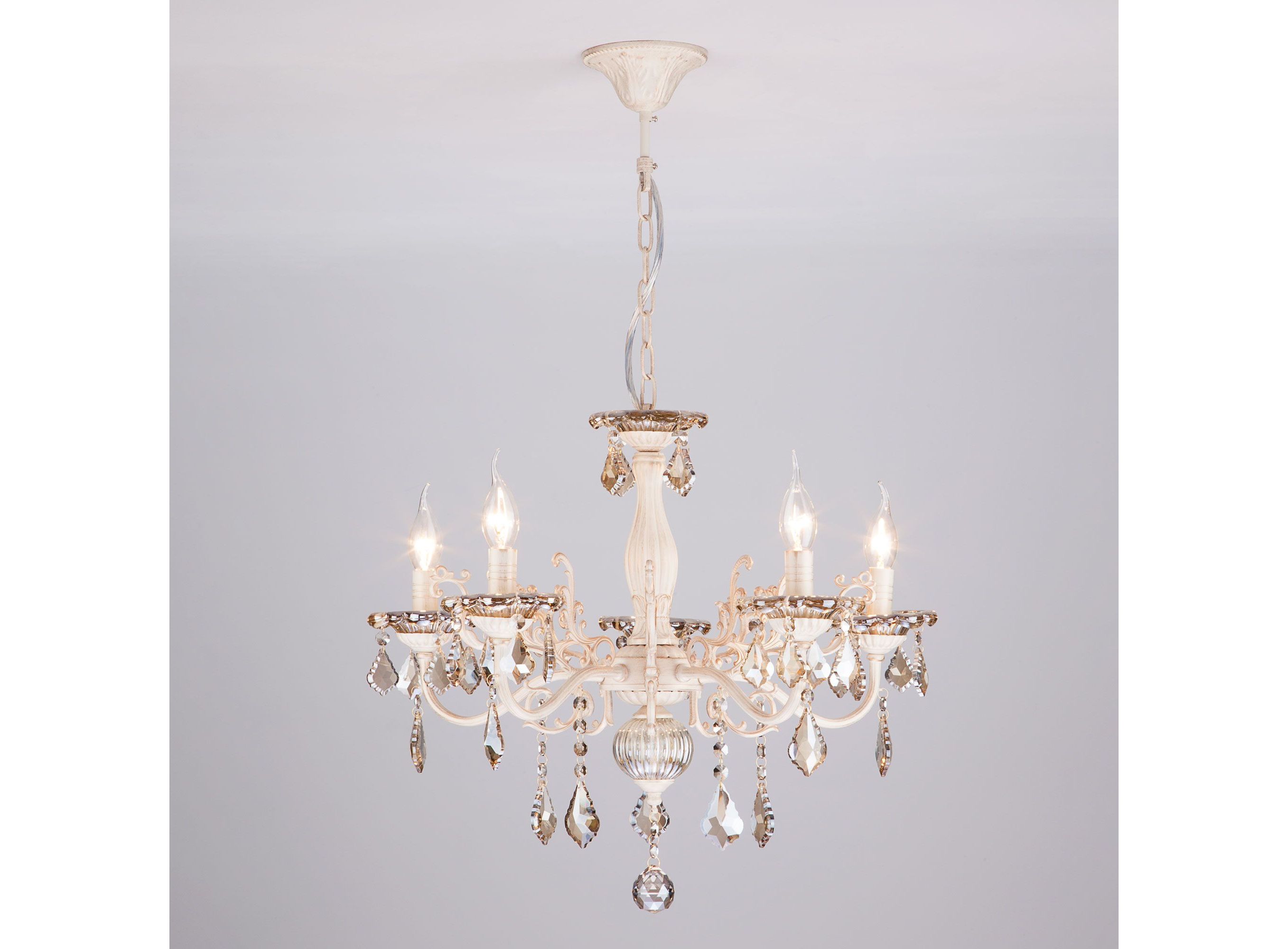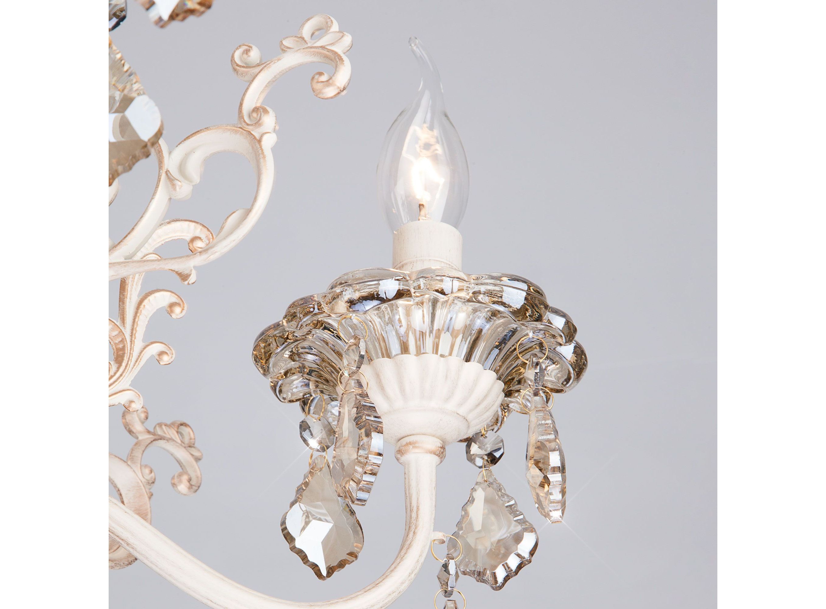 <p>Классическая хрустальная люстра на 5 рожков в цвете белый с золотом / тонированный хрусталь преобразит потолочное пространство и создаст в вашем помещении комфортное полноценное освещение на площади 24 м кв. Изящные формы и классический стиль добавят вашей гостиной утонченного аристократизма.</p>