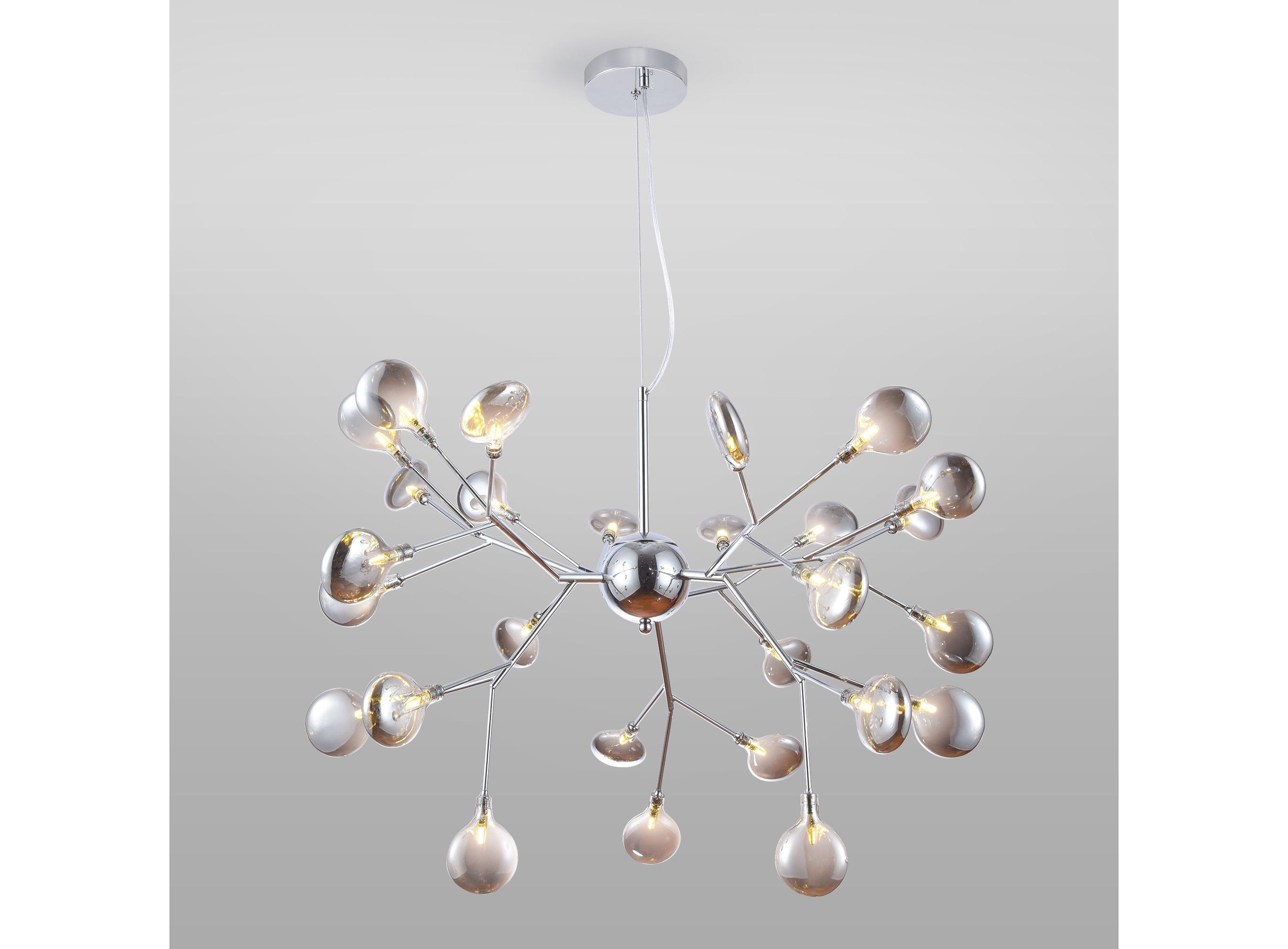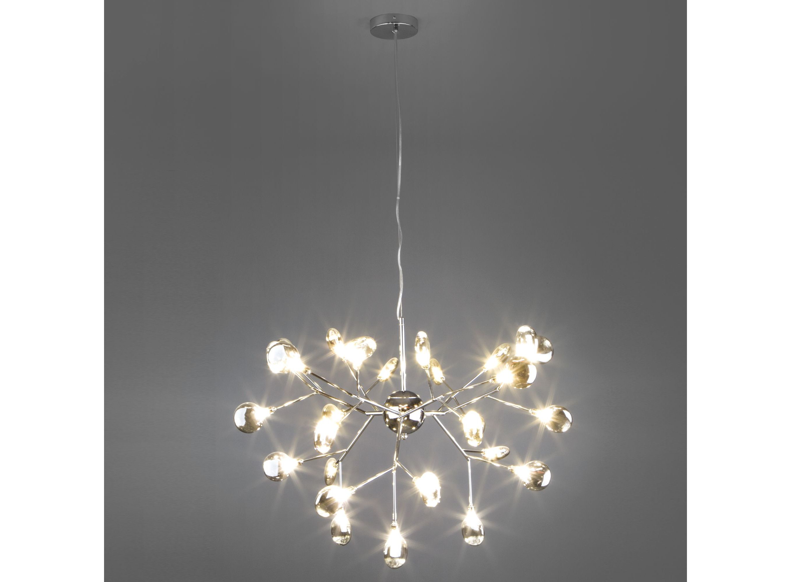 <p>Подвесная люстра со стеклянными плафонами 554 в дымчатом цвете предназначена для создания основного освещения в современных и классических интерьерах. Подходит для различных типов помещений: гостиная, загородный дом и рассчитана на площадь освещения 16 м&sup2;.</p> <p>Дизайнерская люстра имеет 27 рожков и оснащена патронами с цоколем G4, которые рассчитаны на максимальную мощность ламп 3 Вт. Люстра украшена эффектными стеклянными плафонами в форме лепестков. Арматура изготовлена из высококачественного металла с надежным защитным покрытием.</p>