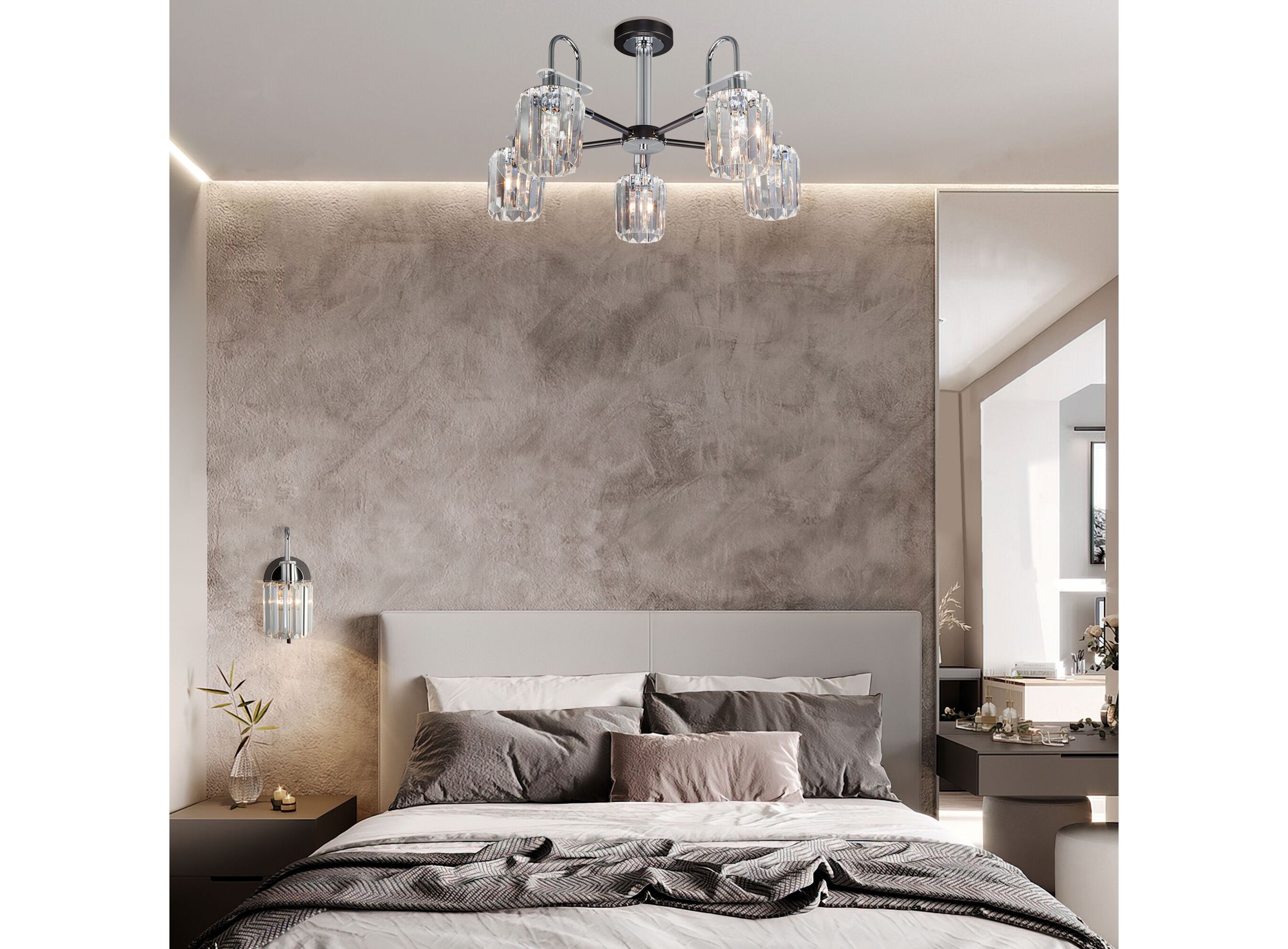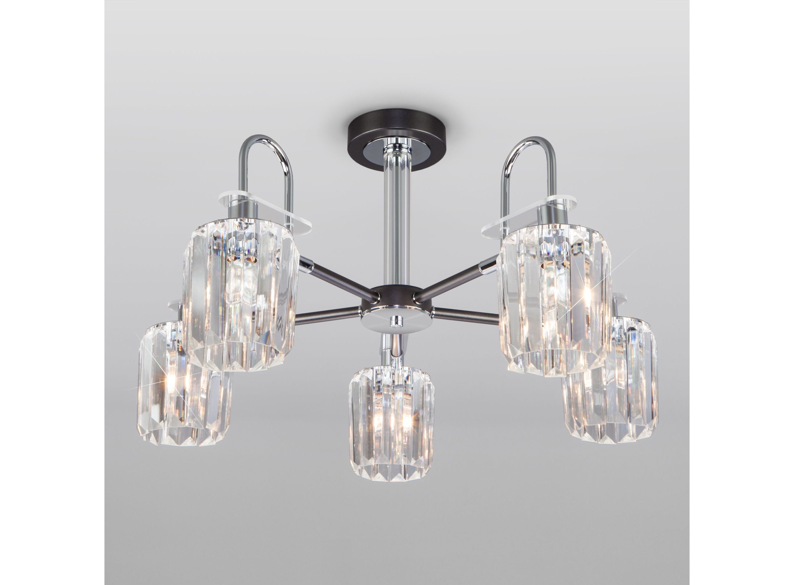 <p>Преобразить ваше потолочное пространство и организовать качественное освещение на площади 23 м кв. поможет стильная люстра в стиле loft. Строгий внешний вид, простота форм, изысканность хрусталя внесут в современный интерьер индустриального стиля и роскоши, а гармоничный цвет графита подчеркнет его.</p> <p>В пятирожковой люстре используются сменные лампы с цоколем E14, рассчитанные на максимальную мощность 60 Вт. Потолочный светильник оснащен хрустальными плафонами.</p> <p>В производстве люстры использован высококачественный металл с надежным защитным покрытием и хрусталь марки Strotskis.</p>