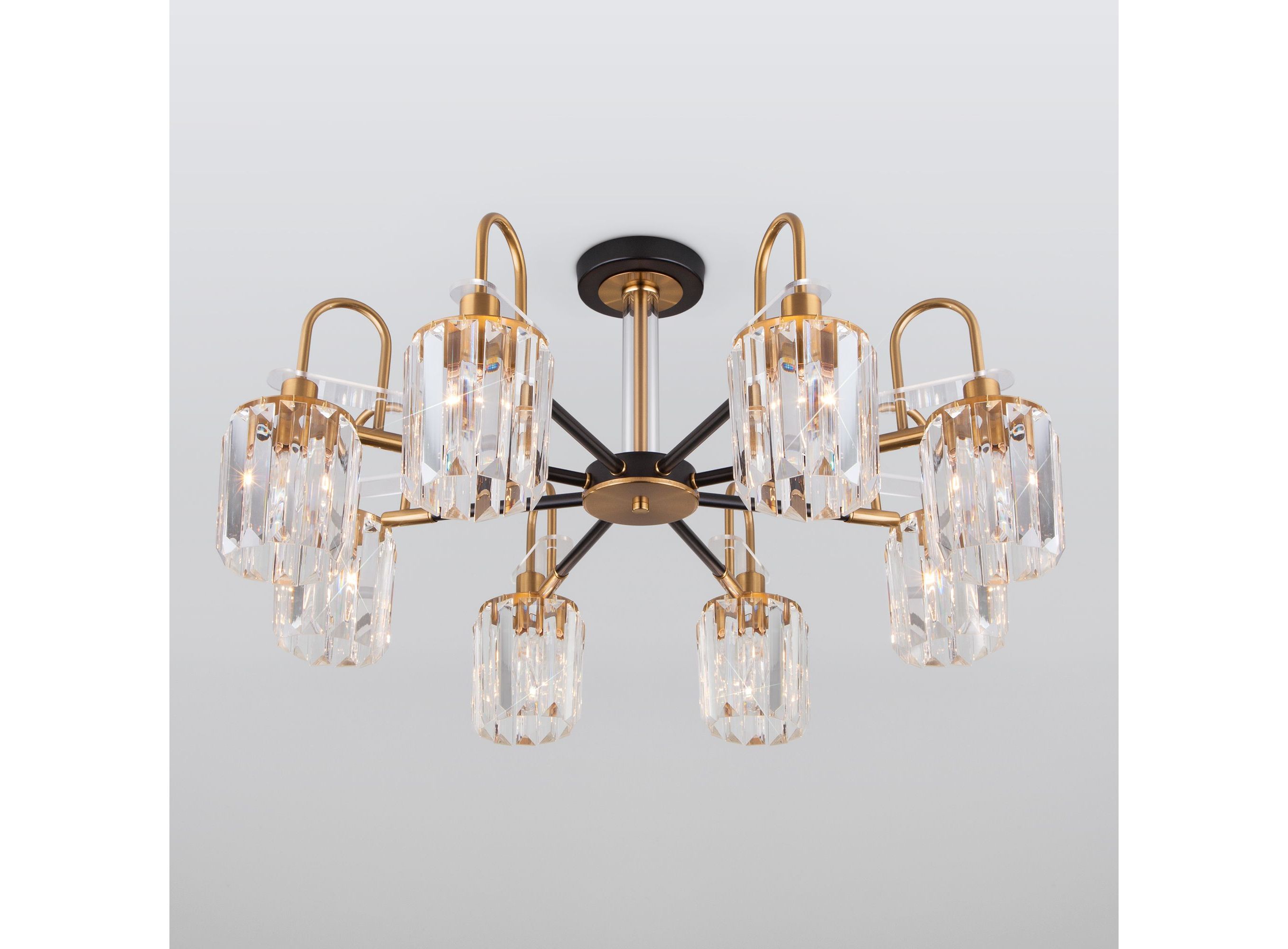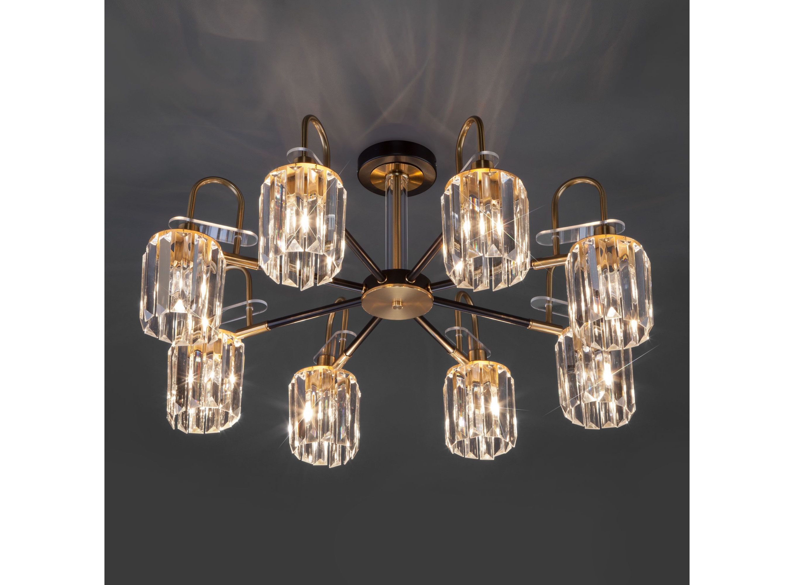<p>Преобразить ваше потолочное пространство и организовать качественное освещение на площади 36 м кв. поможет стильная люстра в стиле loft. Строгий внешний вид, простота форм, изысканность хрусталя внесут в современный интерьер индустриального стиля и роскоши, а гармоничный цвет черный с золотом подчеркнет его.</p> <p>В восьмирожковой люстре используются сменные лампы с цоколем E14, рассчитанные на максимальную мощность 60 Вт. Потолочный светильник оснащен хрустальными плафонами. В производстве люстры использован высококачественный металл с надежным защитным покрытием и хрусталь марки Strotskis.</p>