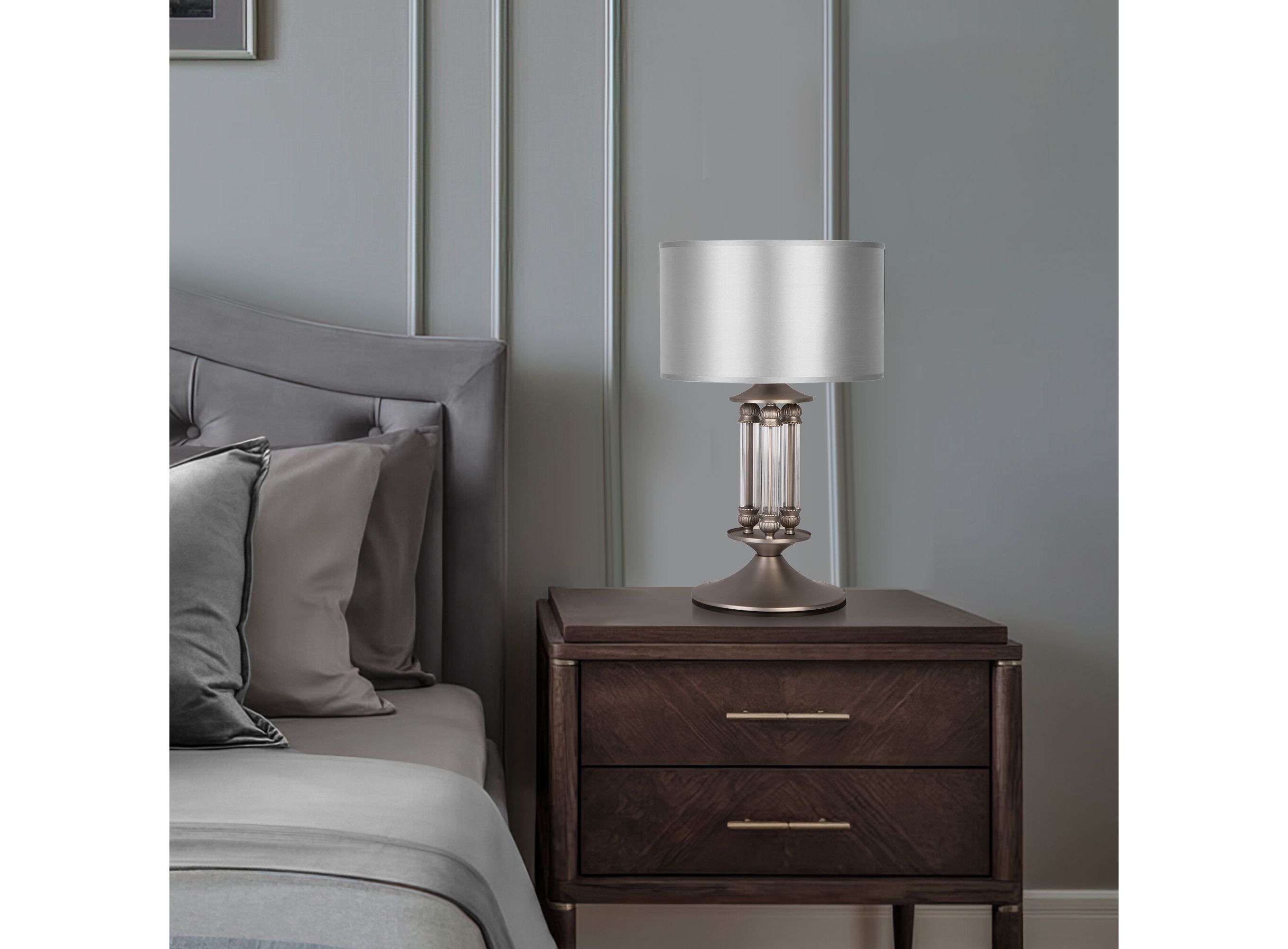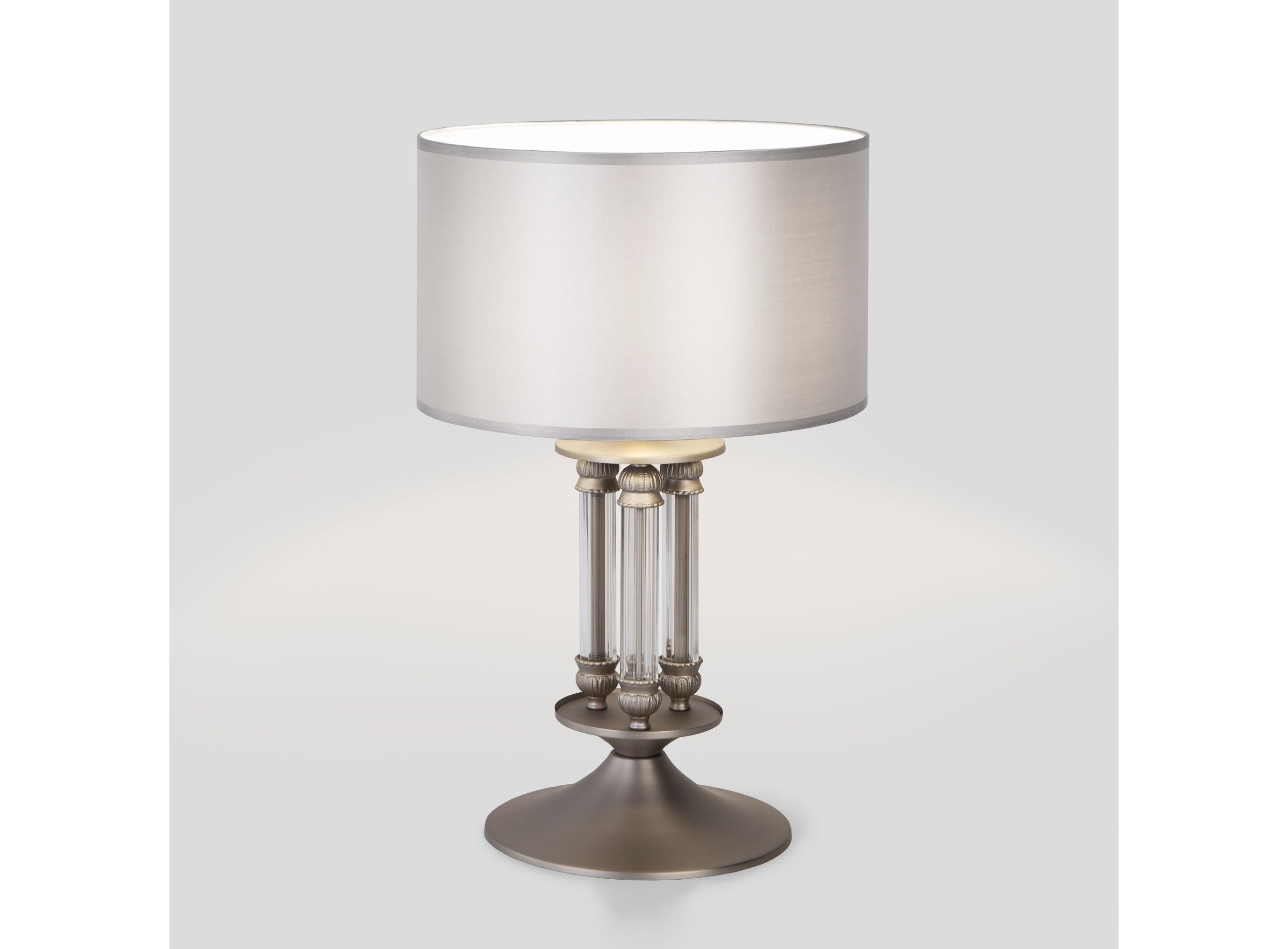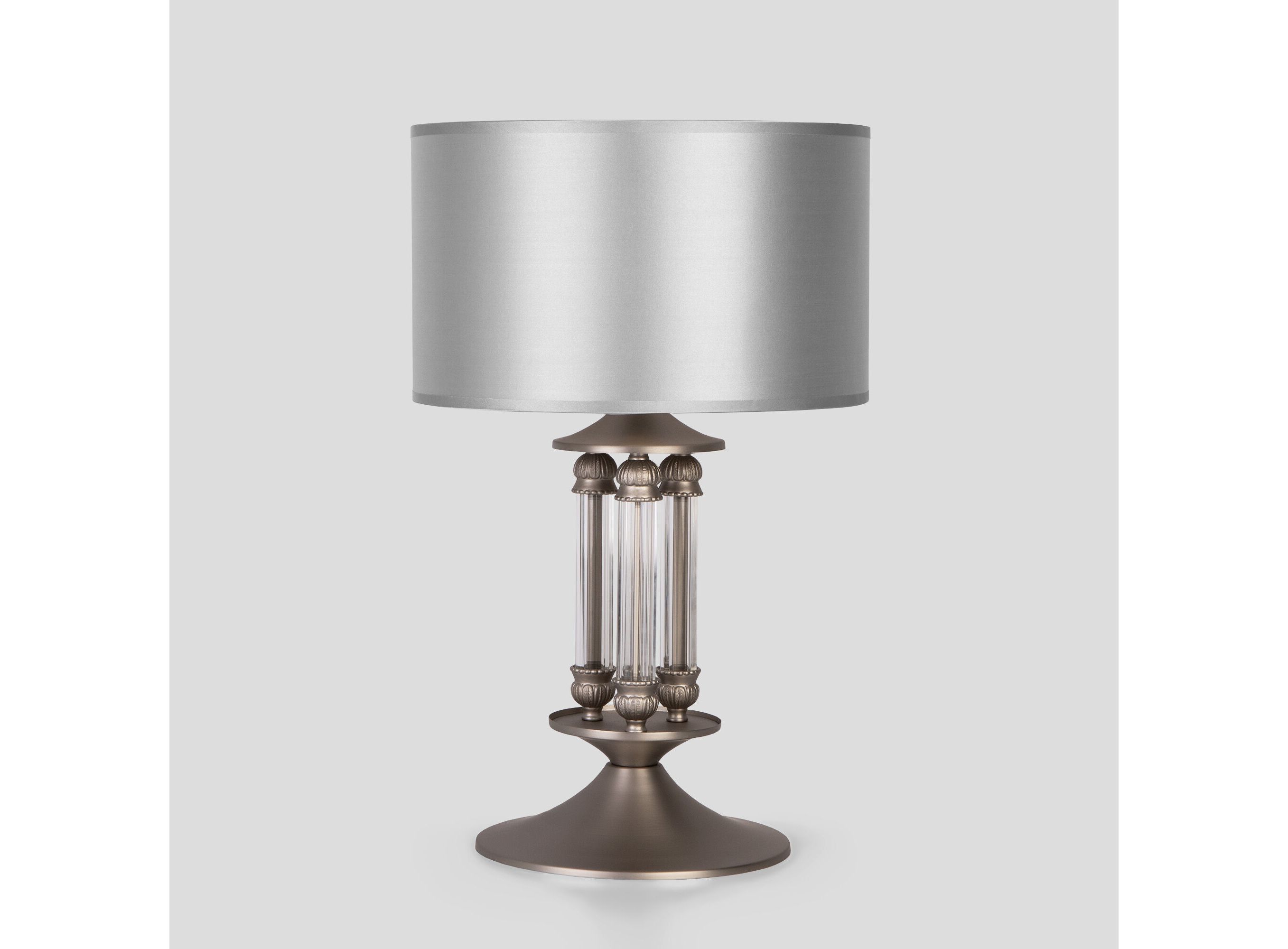 Строгий лаконичный дизайн коллекции «Adagio» позволит использовать ее в интерьерах с различным стилевым исполнением. Атласные абажуры серебряного цвета создают безупречный тандем с основанием цвета сатин-никель, украшенным декоративными элементами из хрусталя.